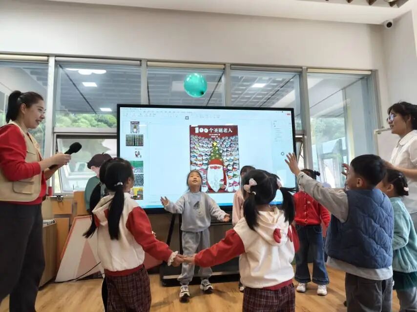紧接着,宝贝们全程眼神发亮,跟着故事节奏时而紧张、时而欢笑,沉浸式穿梭在圣诞魔法小镇的奇妙世界里!“老师!我发现绘本里的圣诞老人的工作和衣服图案是一样的~” “这个圣诞老人他的鼻子和其他人都不同”课堂上,孩子们的小手举得像森林里的小树苗,一个个充满童趣的发现让老师频频惊喜。围绕绘本,我们设计了层层递进的互动问题,孩子们不仅积极抢答,还主动分享自己的独特见解,让绘本阅读变得更有深度。热烈的互动中,宝贝们不仅感受到了圣诞的温暖与美好,更悄悄 get 了 “分享让快乐翻倍” 的小道理,对“圣诞老人的责任:爱与分享” 有了超真切的理解~