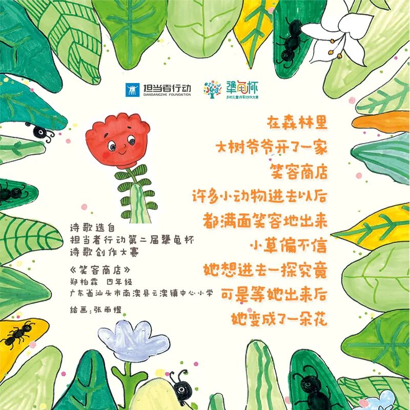 这首《笑容商店》,出自广东汕头云澳镇四年级男孩郑柏霖之手,也是“犟龟杯”第二届乡村儿童诗歌创作大赛的“金犟龟”奖作品。